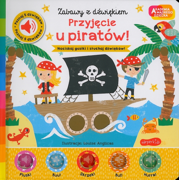 Przyjęcie u piratów to dźwiękowa książeczka należąca do nowej serii Zabaw z dźwiękiem Akademii Mądrego Dziecka. Opowiada o grupie przyjaciół piratów, którzy wyruszają w rejs, by odnaleźć ukrytą skrzynię ze skarbem. Po drodze spotykają różne osoby, którym zadają podobne pytanie – gdzie ukryty jest skarb? Miła surferka pokazuje im drogę, podobnie jak żeglarz z małej czerwonej łódki oraz nurek pływający wśród ryb. Czy piraci odnajdą skarb? Przeczytaj książeczkę i dowiedz się czy udało się piratom. Na każdej stronie książeczki znajduję się obrazek kolorowego guziczka, który trzeba wcisnąć by usłyszeć dźwięk. Dzięki temu maluszek ćwiczy paluszki oraz aparat mowy naśladując usłyszany dźwięk. Dodatkowo ćwiczy skupienie słuchając krótkiego opowiadania. W serii Zabawy z dźwiękiem Akademii Mądrego Dziecka ukazały się także: Cisza!, Rakieta startuje!, Leniwcu, pospiesz się!